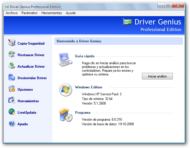 Driver Genius es una herramienta para respaldar y actualizar tu drivers constantemente. Una de sus caracteristicas es, la posibilidad de hacer una copia de seguridad de todos los controladores instalados en tu sistema, comprimida en un archivo ejecutable EXE. Así, para recuperarlos sólo tienes que hacer doble clic en dicho archivo y volverás a instalarlos todos.Otra caracteristicas que posee es restaurar drivers anteriores, desintalarlos y diagnosticar los dispositivos.