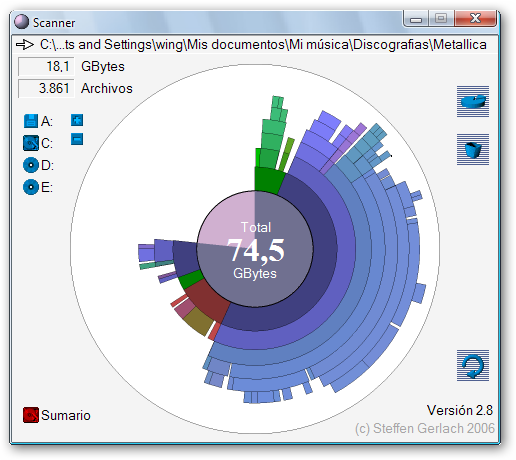 Scanner muestra una gráfica que representa la capacidad total de la unidad y las carpetas incluidas que ocupan tal espacio.