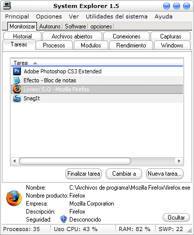 System Explorer es un administrador de tareas similar al que posee windows pero con muchas funciones mas. Es una aplcacion totalmente recomendable mucho mas funcional que el de windows, bueno algunas funciones que posee son; el desintalador de aplicaciones, un gestor de inicio, agregados de IE, monotoriza; tareas, procesos, conexiones archivos abiertos etc.
