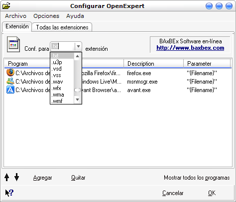 OpenExpert reemplaza el menú "Abrir con" por uno más potente y flexible. Pulsando en "Agregar aplicación" con el que añadiras un programa a la lista. Pero tambien puedes añadir o quitar programas asociados a una extensión, así como modificar sus parámetros de ejecución.