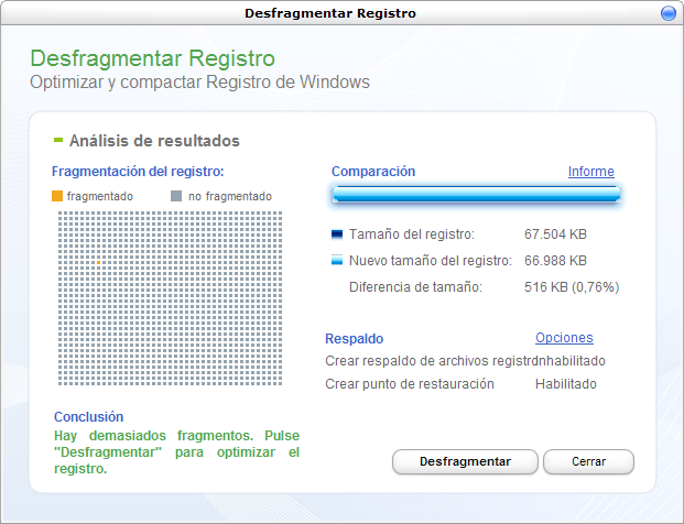Quicksys RegDefrag es una herramienta que analizara el Registro de Windows y lo desfragmentara. Esta operación acelera el acceso a las aplicaciones y agiliza el sistema en general. Al desfragmentar analizara el disco para luego proceder a desfragmentarlo, durante este proceso no se puede ocupar ninguna otra aplicacion hasta que termine. pero esto sera solo algunos segundos.