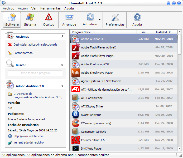 Uninstall Tool es una herramienta que nos ayudara a desinstalar programas de nuestro sistema, nos mostrara desde el tamaño que ocupa cada uno de ellos (incluso las aplicaciones ocultas), hasta las entradas no validas. Tambien posee un administrador de aplicaciones y un buscador integrado con el que podras abrir directamente el directorio y entrada del Registro del programa seleccionado.
