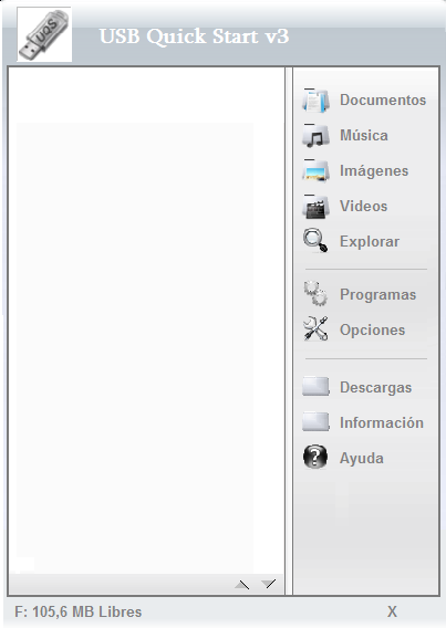 USB Quick Start es un Menú de inicio para nuestros USB, los que nos ayudara a tener acceso a todas nuestras aplicaciones portátiles y ficheros de música, vídeo o texto que tengamos en nuestra llave USB. Tambien se puede perosonalizar los fondos con imagenes especificas, los iconos, las carpetas y mucho más.
