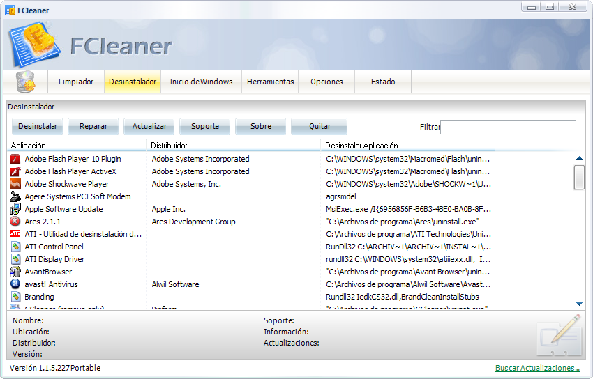 FCleaner Portable 1.1.5.227, Limpia ficheros, desintala aplicaciones y gestiona el inicio
