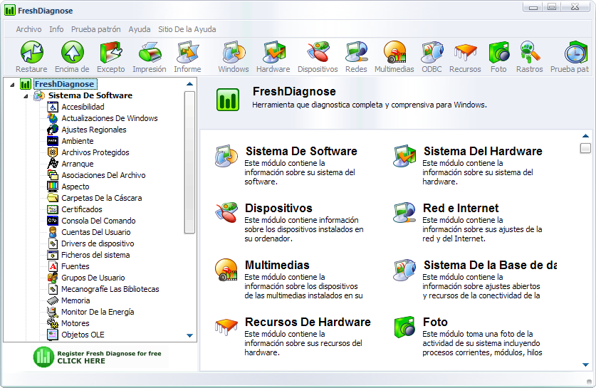 Fresh Diagnose es una herramienta que te permite analizar todos los componentes que integran tu Ordenador. Te dará datos detallados separado por varios modulos como; hardware, software, dispositivos multimedia, periféricos, fuentes de datos, ajustes de red y internet y muchas otras cosas