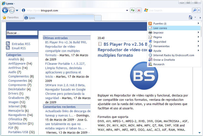 Bsplayer es Reproductor de video rapido y funcional, destaca por ser compatible con varios formatos, ventana de reproduccion ajustable con la rueda del raton, y una multitud de opciones que facilitan el uso al usuario.