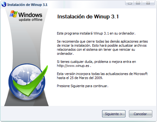 Winup es un práctico pack que contiene todos los parches oficiales de Microsoft para Windows XP con instalador propio. Te evita descargarlos a través de Windows Update, y es especialmente útil si tienes varios equipos, ya que no tendrás que descargarlos en cada uno de ellos. El unico requisito que pide es tener instalado Windows XP + SP3