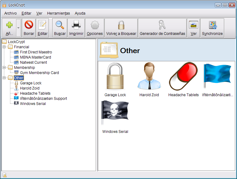 LockCrypt es una aplicacion que nos permitira guardar de todo: contraseñas de programas y páginas web, números clave de tarjetas bancarias, datos médicos, combinaciones de cerraduras, números de serie, etc. Todos estos datos los guarda codificados bajo una contraseña de administrador sin la cual es imposible acceder a ellos